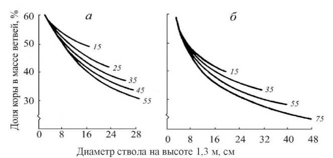 Рис. 1. Изменение доли коры в массе ветвей в абсолютно сухом состоянии в зависимости от диаметра ствола и возраста деревьев (показан цифрами) осины (а) и берёзы (б) [18]