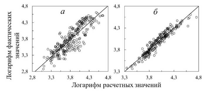Рис. 2. Соотношение фактических и расчётных по моделям (1) и (2) значений доли коры в массе ветвей естественных сосняков (а) и культур (б)