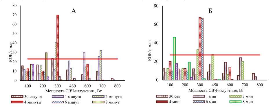 Изучение воздействия СВЧ-полей на бактерии и микроскопические грибы (рис. 3) выявило подавляющее и стимулирующее действие излучения. Эффективное подавление микроорганизмов отмечалось при мощности излучения в диапазоне 300–450 Вт и временной экспозиции для грибов 6–10 минут, для бактерий – 8–10 минут.