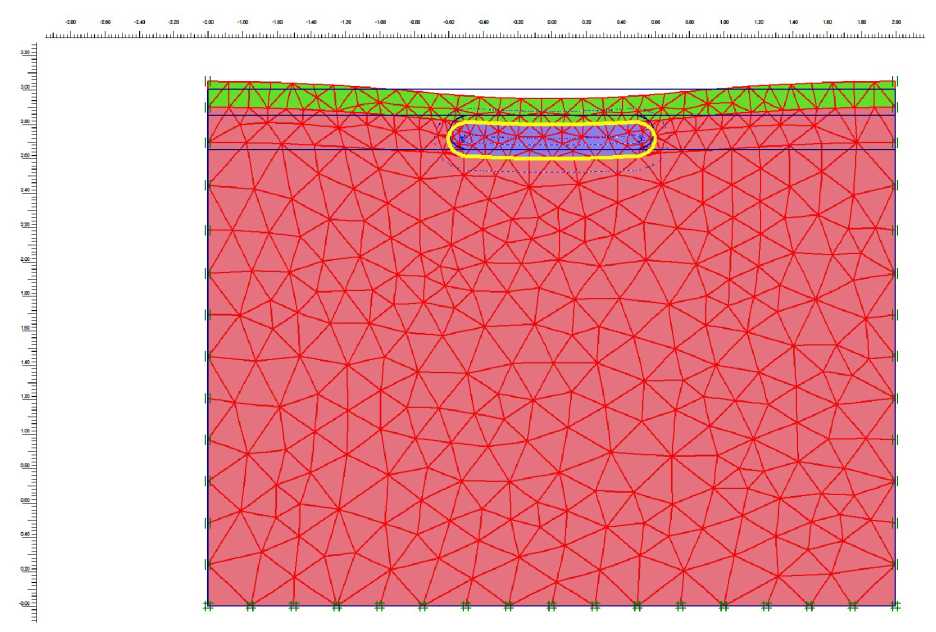 В задачи входило исследование влияния толщины и ширины геосинтетических оболочек на вертикальную осадку покрытия под колесом расчётного автомобиля и на максимальные растягивающие напряжения в геосинтетических оболочках.