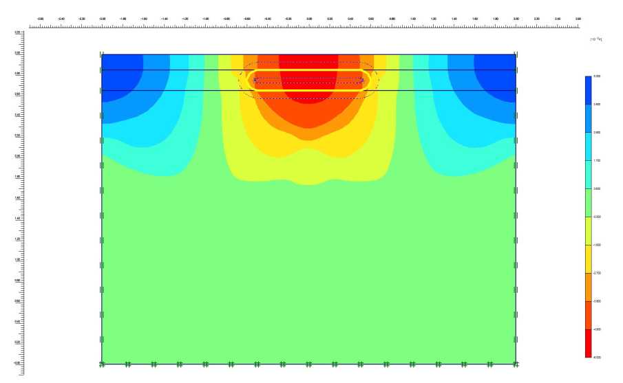 Fig. 5. Vertical displacement distribution for a pavement structure reinforced with a geosynthetic shell with a thickness of 0.2 m and a width of 1.2 m