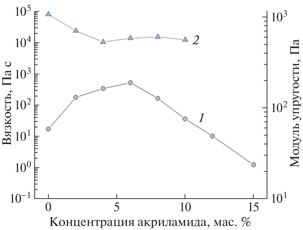 Исследованы структура и реологические свойства водных растворов анионного поверхностно-активного вещества олеата калия и водорастворимого мономера акриламида до и после проведения радикальной полимеризации. В отсутствие мономера и в присутствии низкомолекулярной соли олеат калия образует сетку из длинных переплетающихся цилиндрических (червеобразных) мицелл. Добавление мономера не приводит к изменению их цилиндрической формы и радиуса, однако способствует трансформации разветвленных мицелл в линейные. После проведения полимеризации структура агрегатов ПАВ значительно изменяется – согласно данным нейтронного рассеяния она становится биконтинуальной, а ее локальная геометрия – ламелярной. Сосуществование такой структуры с макромолекулами полиакриламида в полуразбавленном растворе приводит к значительному синергетическому увеличению вязкости и модуля упругости.