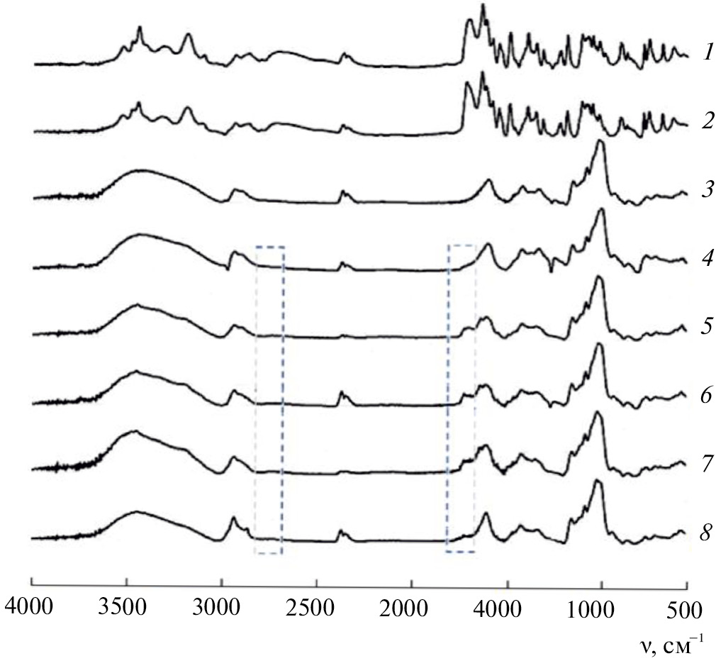 Рис. 1. ИК-спектры ацикловира до (1) и после механообработки в шаровой мельнице (2), смеси крахмал–КМЦ (3), смеси крахмал–КМЦ–ацикловир до (4) и после механообработки в экструдере (5), шаровой мельнице (6), реологического взрыва (7), а также губки из экструдата (8). Цветные рисунки можно посмотреть в электронной версии