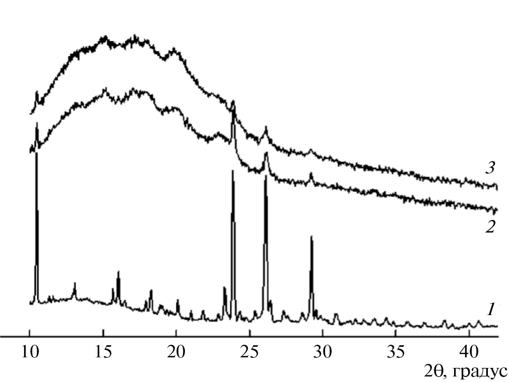 Физико-химические методы исследования. Порошкообразные образцы перед анализом выдерживали в течение 1 сут. в эксикаторе над Р2О5. ИК-спектры записывали на спектрофотометре “TENSOR 27 FT-IR” (Германия) в спектральной области 550–4000 см–1 при разрешении 4 см–1. Регистрацию и обработку спектров проводили с помощью пакета программ “Win-IR” версия 4 (“Bio-Rad, Digilab Division”). Калориметрические исследования выполняли на синхронном термоанализаторе “NETZSCH STA 449 F3 Jupiter” (Германия) в алюминиевых тиглях (атмосфера аргона, температурный интервал 20–320°C, скорость нагревания 10°C/мин). Рентгеноструктурные исследования проводили на дифрактометре “D8 Advance” (Германия) с вращением образца методом съемки “на просвет” в диапазоне углов рассеяния 2q = 10°–50° с фокусирующим германиевым кристаллом-монохроматором на первичном пучке (CuKα–излучение, длина волны λ = 0.1542 нм).