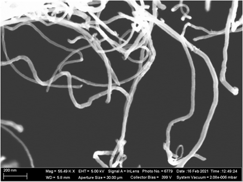 Исследовали гидроксиэтилцеллюлозу (ГЭЦ) марки Natrosol 250 LR (“Aqualon”, США) с молекулярной массой Mη = 8.4 × 104 и степенью замещения 2.5. Наполнителем служили углеродные нанотрубки (УНТ) с диаметром от 7 до 15 нанометров (рис. 1), предоставленные Институтом катализа им. Г. К. Борескова (г. Новосибирск). В качестве растворителей использовали дистиллированную воду и этанол. Чистоту растворителей оценивали по показателям преломления с помощью рефрактометра “Atago NAR-2T LO”. Растворы ГЭЦ готовили в смеси вода : этанол (80:20 мас. ч.) при комнатной температуре с последующим фильтрованием через стеклянный фильтр ПОР 100 с размерами пор 40‒100 мкм. Для стабилизации ГЭЦ использовали бензойную кислоту в соотношении 0.4 мас. ч на 100 мас. ч. полимера.