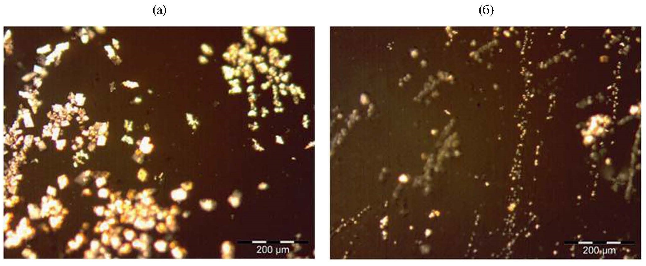 Рис. 3. Микрофотографии плёнок ГЭЦ, полученных вне поля (а) и в поле (б). Поляроиды скрещены.