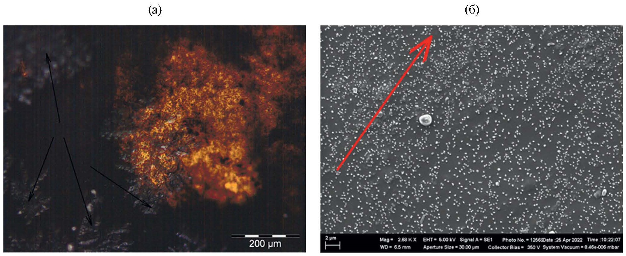 Результаты исследований плёнок ГЭЦ с содержанием УНТ 3% методом сканирующей электронной микроскопии представлены на рис. 4б. На поверхности плёнки белые точки относятся к агрегатам УНТ. Наблюдаются области преимущественной ориентации этих агрегатов (стрелка показывает направление ориентации).