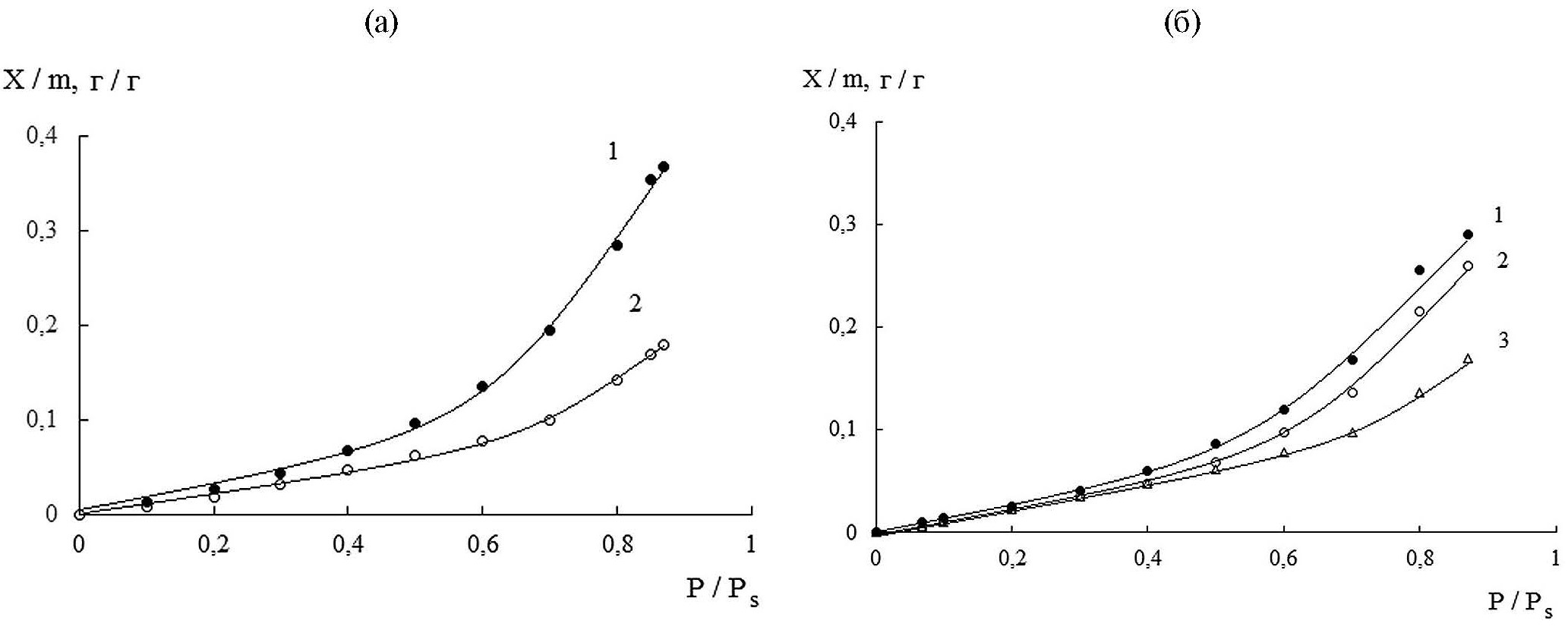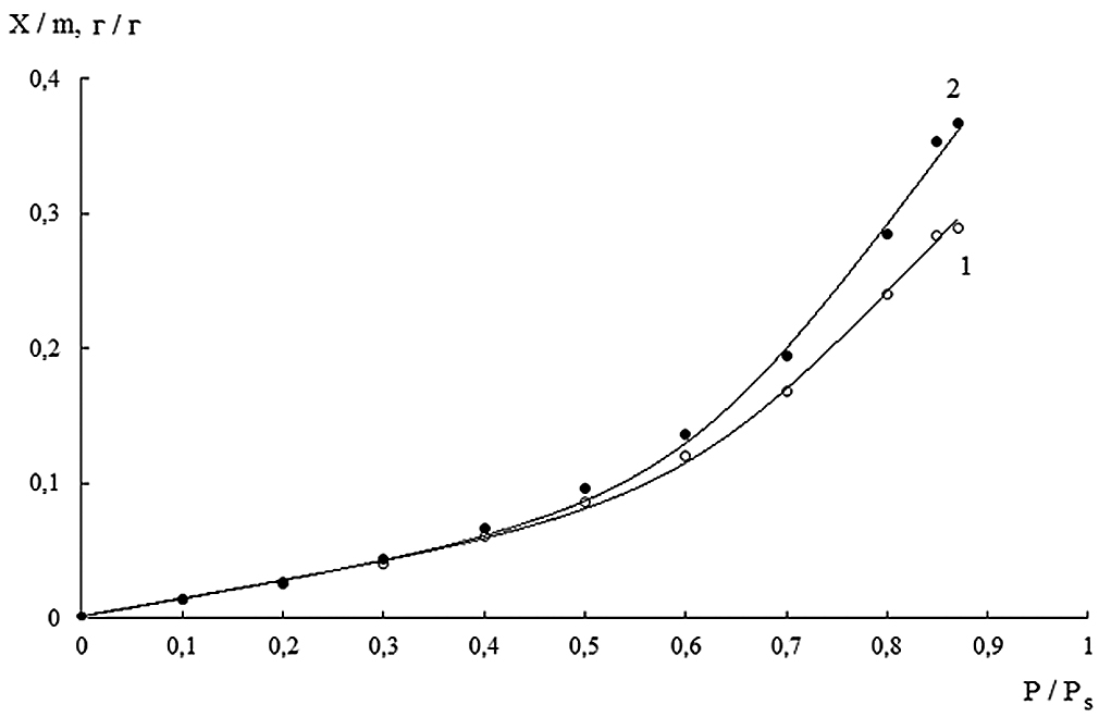 Изотермическую интервальную равновесную сорбцию паров воды изучали с использованием автоматического анализатора “ASAP 2020” фирмы “Micromeritics”. Изменение удельных химических потенциалов паров воды Δµ1 рассчитывали на основании экспериментально полученных изотерм сорбции по уравнению [17]
