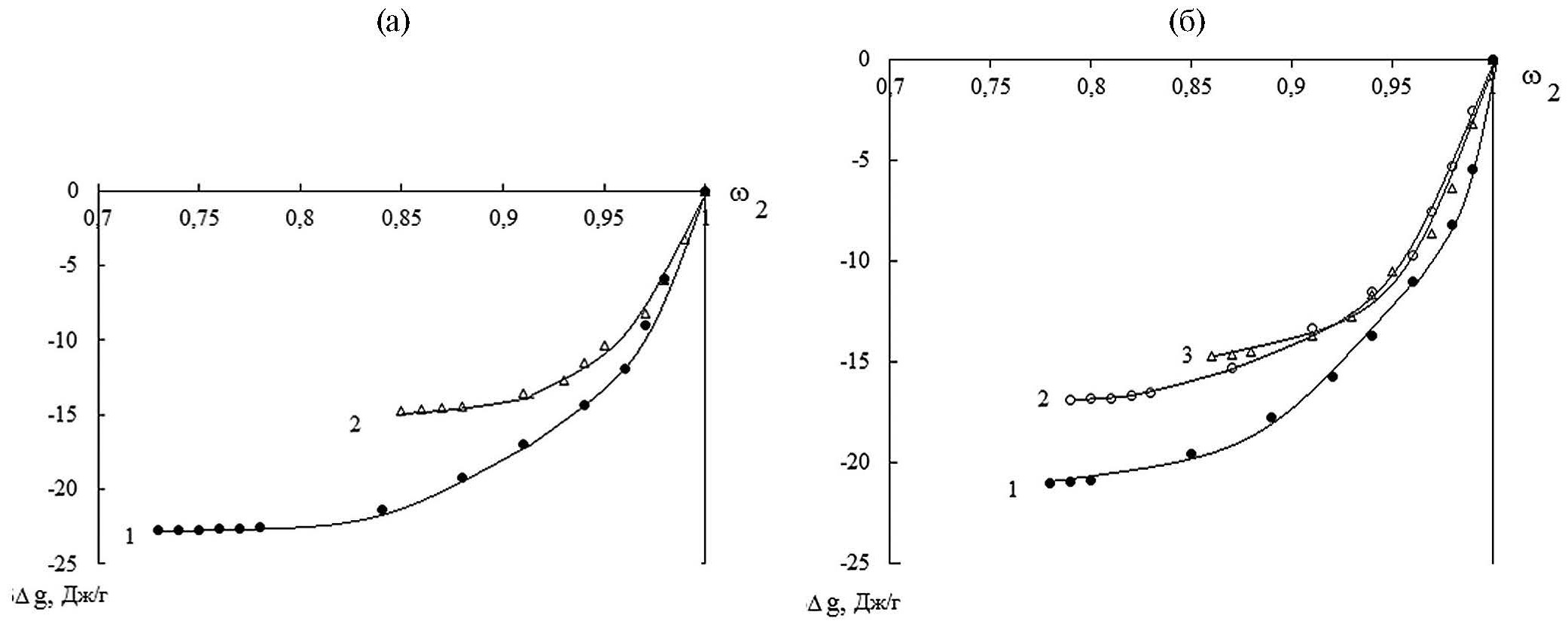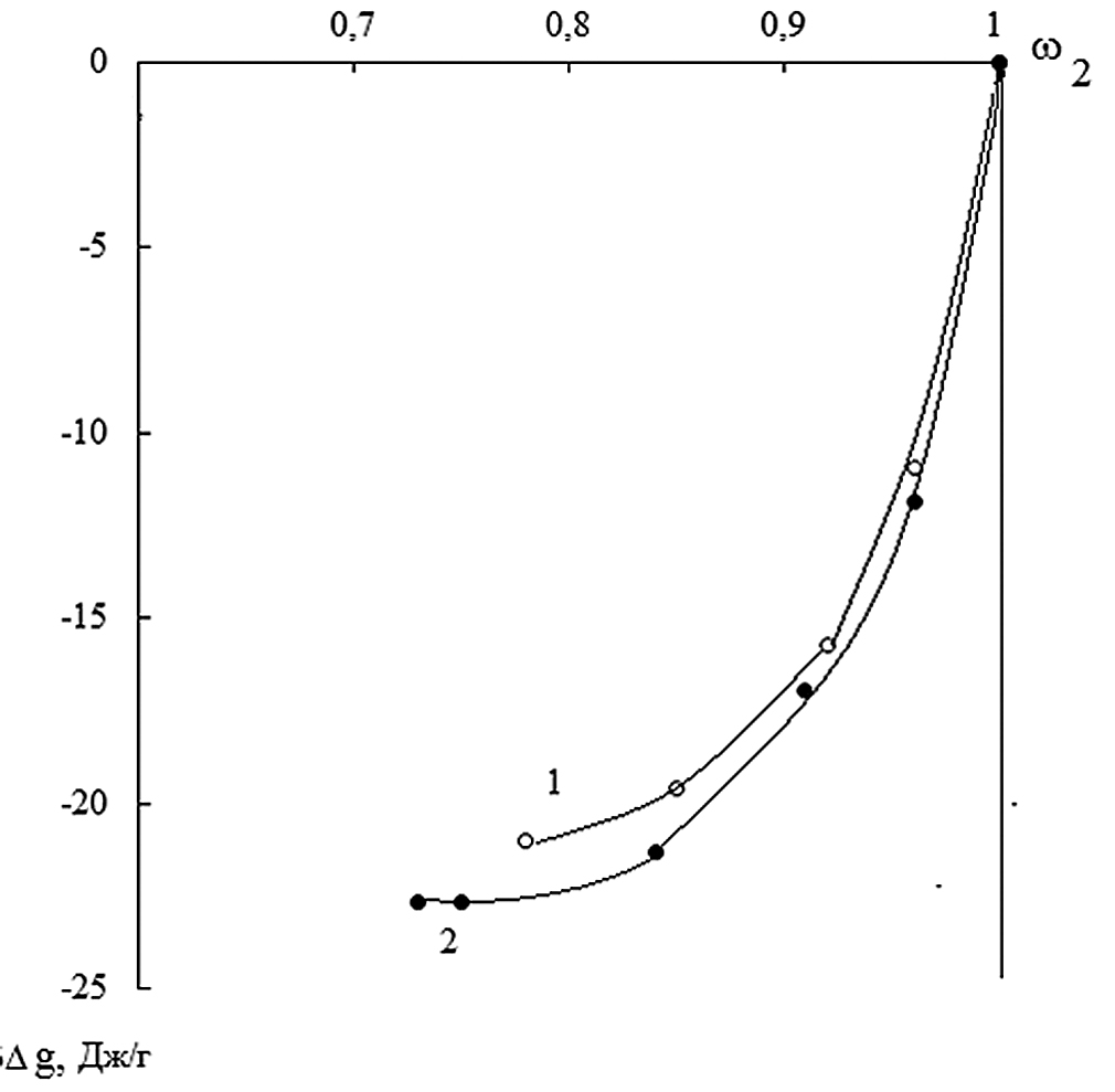 где M1 – молекулярная масса воды, – относительное давление (Рs – упругость насыщенного водяного пара). Изменения удельного химического потенциала полимера Δµ2 определяли по уравнению Гиббса–Дюгема [17]