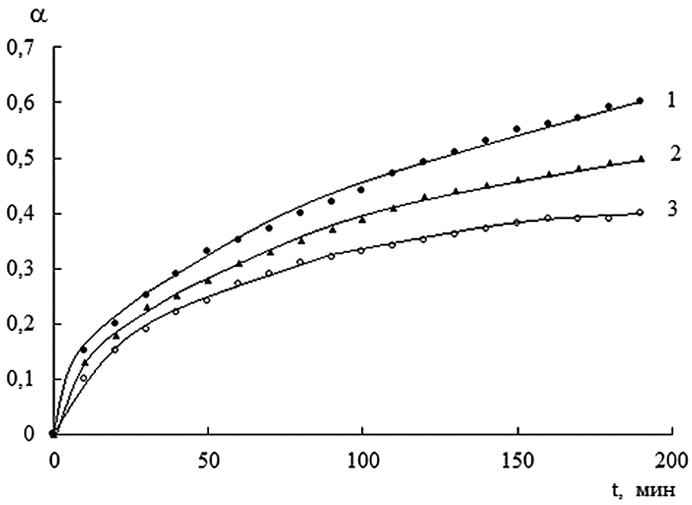 Рис. 8. Кинетические кривые набухания в парах воды пленок ГЭЦ/УНТ, полученных как в магнитном поле, так и вне поля. Содержание УНТ 0 (1) и 5 % (2, 3). Н = 0 (1, 2) и 3.7 кЭ (3).