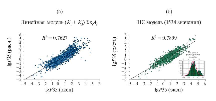 Рис. 6. Сравнение экспериментальных и расчетных значений lgP35 / deff2 для линейной (K2 = ΣxiAi) (а) и нейросетевой (б) моделей. Единицы измерения: P35 – Баррер, deff – ангстремы.