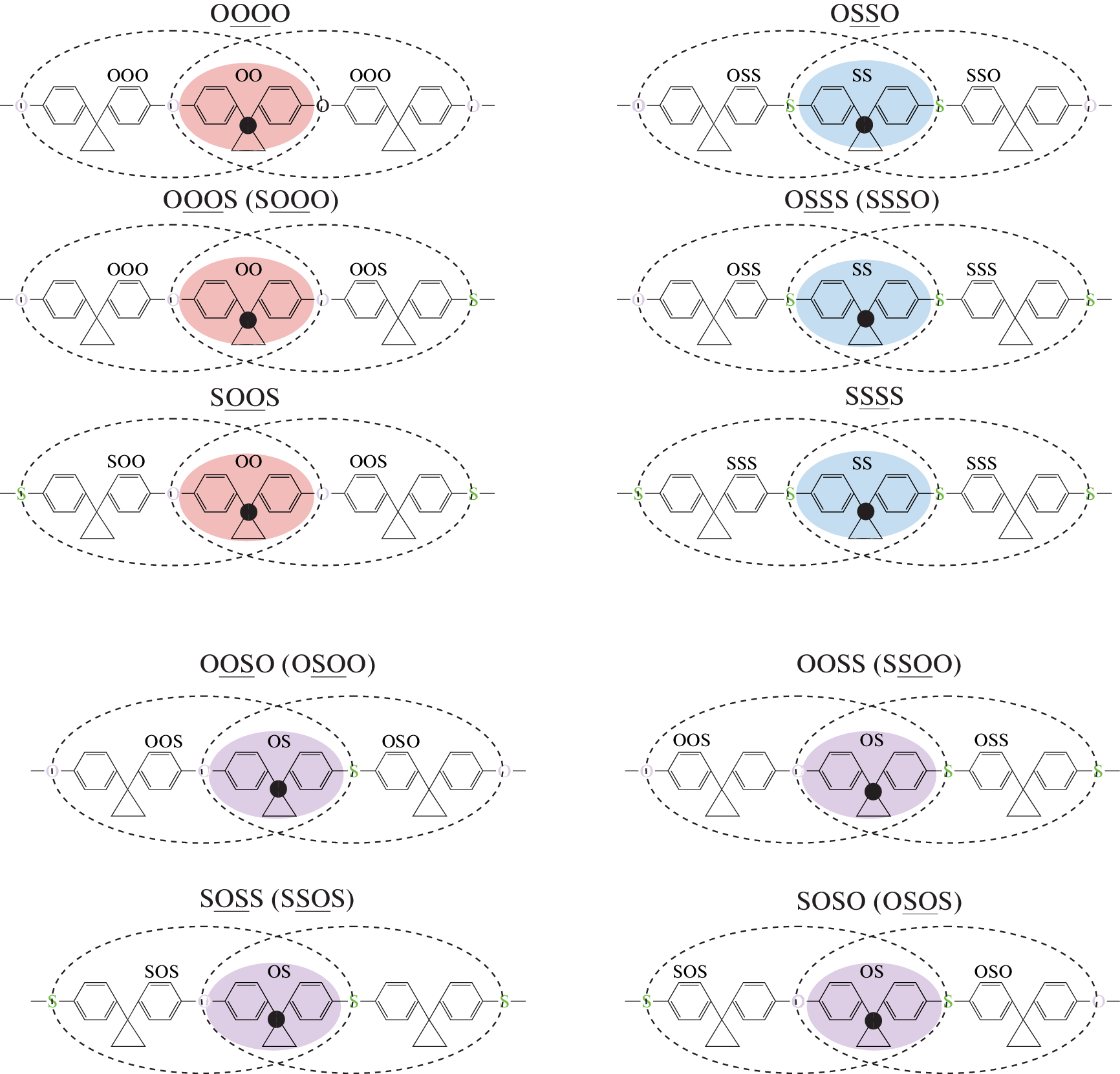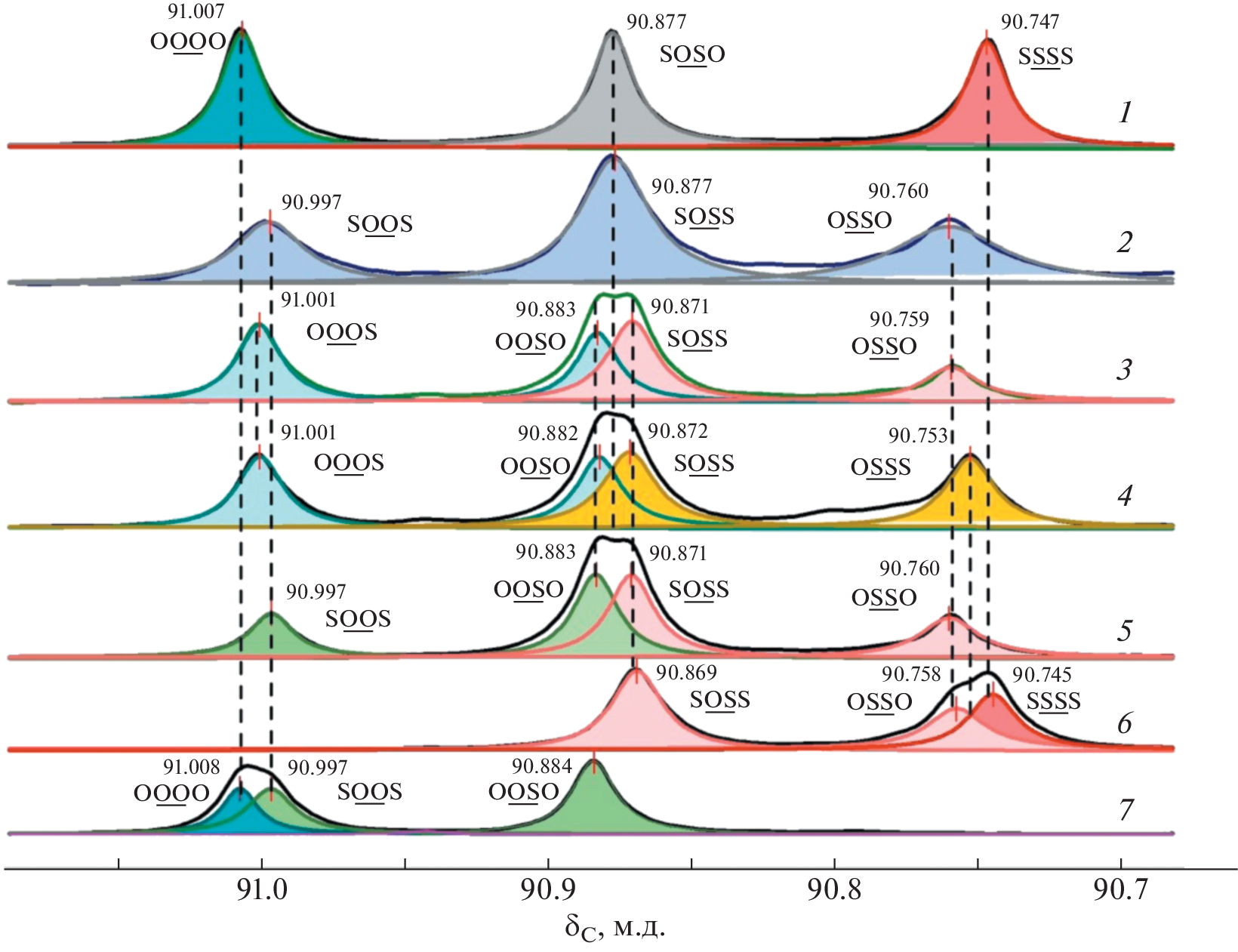 Tetrad splitting of the quaternary sp3-hybridized carbon atom in a series of model (co)poly-arylenephthalides differing in the length of the phenyleneoxyphthalide (O) and phenylenethiophthalide (S) sequences: O-1, OOOS-2, OOS-3, OS-4, SSO-5, SSSO-6, S-7, and OOSS-8 has been studied using the increments method. Basing on the analysis of the amplitude values of the dyad increments, the tetrad increments have been calculated and the position of the signals of the tetrads in the 13С NMR spectra of the individual (co)polyarylenephthalides and their mixtures has been predicted. Validity of the calculations has been confirmed by the coincidence between the predicted and the experimental values of the dyad and tetrad increments for the specifically synthesized (co)polyarylenephthalide OOSS-8, the spectra of the mixtures of the (co)polyarylenephthalides with equimolar content of the split tetrads, and good coincidence of their starting compositions calculated from the deconvoluted spectra.