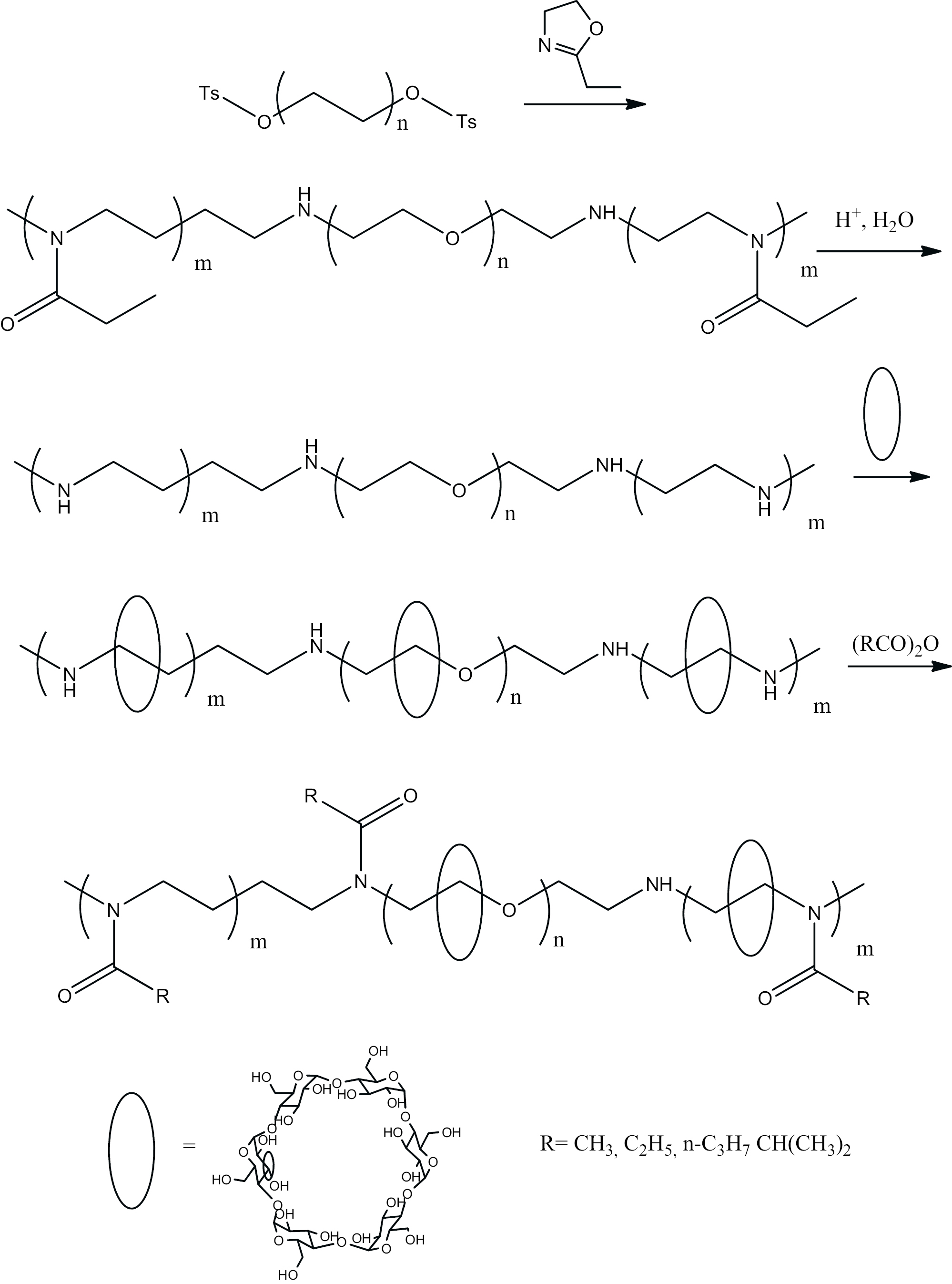 Для получения изомерных полиротаксанов с более равномерным расположением остатков циклодекстрина вдоль цепи, дитозилат ПЭГ2000, полученный взаимодействием ПЭГ-2000 с тозилхлоридом в условиях реакции Эйнхорна (хлороформ, пиридин, 4-диметиламинопиридин), был использован в качестве инициатора полимеризации 2-этил-2-оксазолина по схеме. В результате был синтезирован поли-2-этил-2-оксазолин–блок–ПЭГ-2000–блок–поли-2-этил-2-оксазолин. Кислотный гидролиз полученного сополимера (водная HCl, 100 °С, 24 ч) позволил получить ПЭИ–блок–ПЭГ-2000–блок–ПЭИ. Нагревание этого сополимера с насыщенным водным раствором альфа-циклодекстрина в щелочной среде (рН 11) провело к получению псевдоротаксана: полиэтиленимин@альфа-циклодектрин–блок–ПЭГ-2000-@альфа-циклодектрин–блок–полиэтиленимин@альфа-циклодектрин (Р1) со статистическим распределением макроциклов вдоль цепи. Блокирование макроциклов на основной цепи было проведено ацилированием свободных аминогрупп полиэтилениминных блоков избытком ангидридов: уксусной, пропионовой, масляной и изомасляной кислот при рН 12, т.е. в условиях, обеспечивающих гидролиз получающихся в качестве побочных продуктов ацилированных остатков циклодекстрина. В результате синтеза (Схема 1) были получены образцы неописанных ранее полиротаксанов: поли-2-алкил (метил, этил, пропил, изопропил)-2-оксазолин@альфа-циклодекстрин–блок–ПЭГ-2000@альфа-циклодекстрин–блок–поли-2-алкил(метил, этил, пропил, изопропил)-2-оксазолин@альфа-циклодекстрин (Р2–Р5) со статистическим распределением макроциклов вдоль цепи.