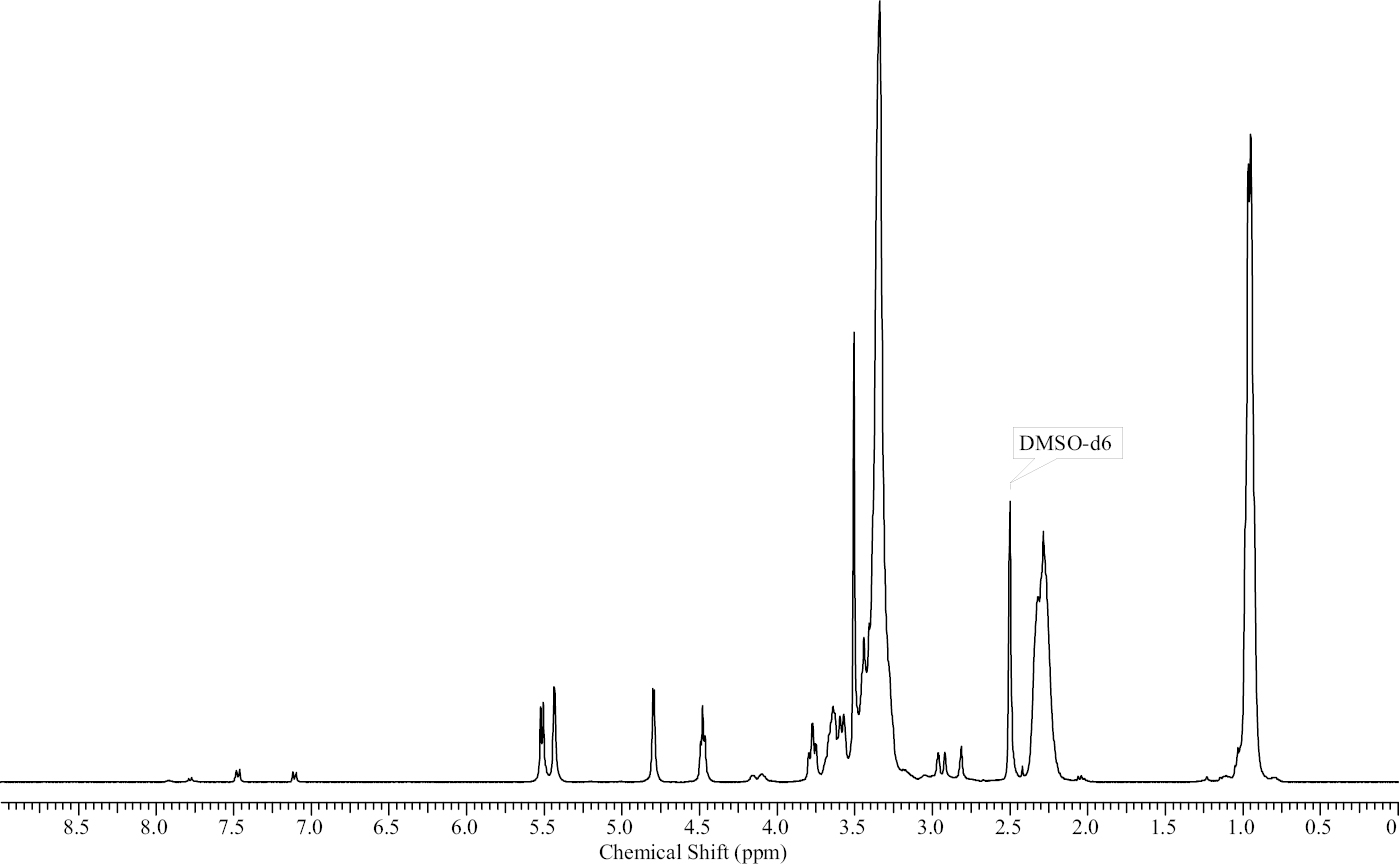 ЯМР 1Н (ДМСО, dн, м.д.): 5.52 (OН-2, д); 5.41 (ОН-3, д); 4.80 (СН-1, д); 4.48 (ОН-6, т); 3.51 (СН2–СН2–O, с); 3.33 (СН2–СН2–N, c); 2.28 (CO–CH2–CH3, ш.с); 0.96 (CO–CH2–CH3, ш.с).