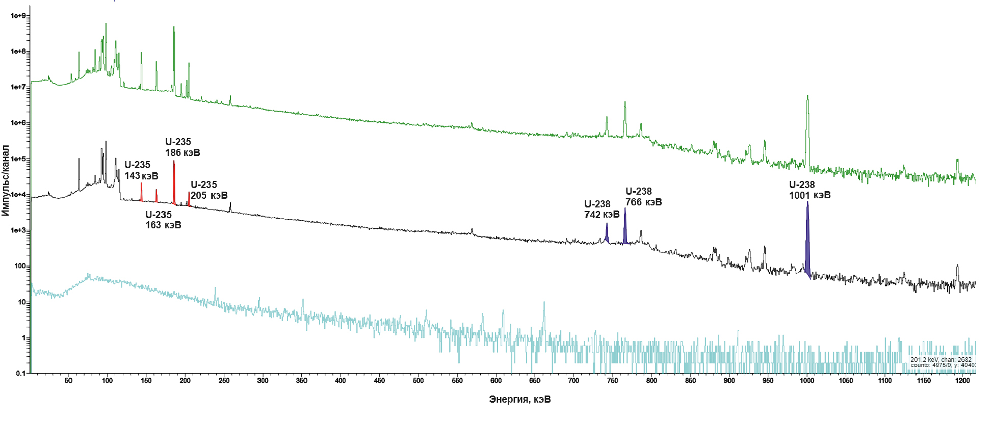 Рис. 1. HPGe-спектрометрометрическое (гамма-спектр) определение изотопов урана: 1 – гамма-спектр уранового стандарта, 2 – гамма-спектр исследуемого раствора уранил-нитрата, 3 – фоновый гамма-спектр. Цветные рисунки можно посмотреть в электронной версии