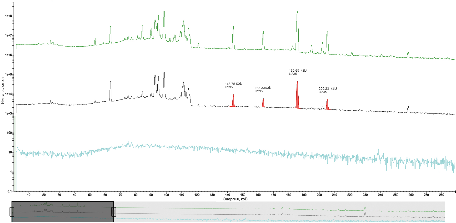 Рис. 2. HPGe-спектрометрическое определение урана U-235 (гамма-спектр в области низких значений энергии): 1 – гамма-спектр уранового стандарта, 2 – гамма-спектр исследуемого раствора уранил-нитрата, 3 – фоновый гамма-спектр
