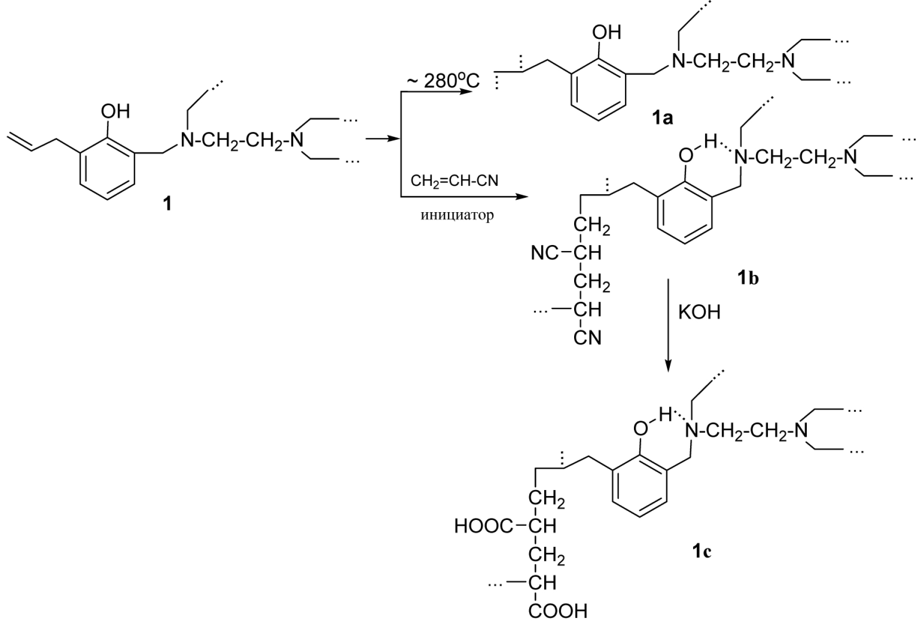 Гидролиз структурированного акрилонитрилом соолигомера (1б) вели в присутствии 10%-ого водного раствора гидроксида натрия кипячением в течение 10 ч. Полученный продукт сушили под вакуумом (3–4 мм рт.ст.). Выход 1в составил 84%.