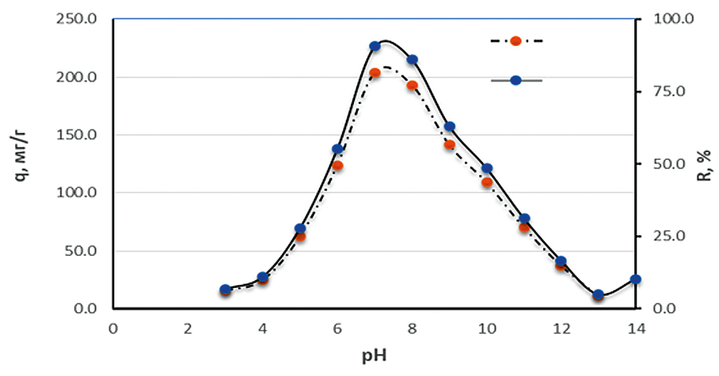 На рис. 7 приводятся результаты исследований по изучению влияния рН среды на степень извлечения уранил-ионов и на сорбционную емкость сорбента 1в в статистических условиях (температура 25°С, исходная концентрация уранил-ионов в воде 134.5 мг/л, время выдержки 24 ч). Видно, что высокая степень извлечения уранил-ионов (R) из водной среды (90.8%) достигается при рН 7. При этом сорбционная емкость q ~ 204 мг/г.