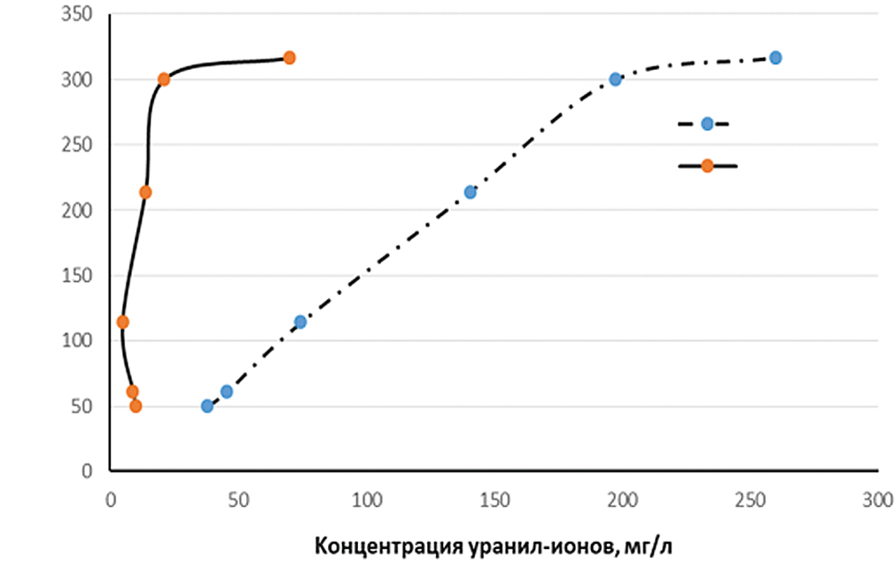 Используя аммиачный раствор и уксусную кислоту (в определенных соотношениях), регулировали pH среды, от которой в значительной степени зависят поведение уранил-ионов и эффективность сорбента.