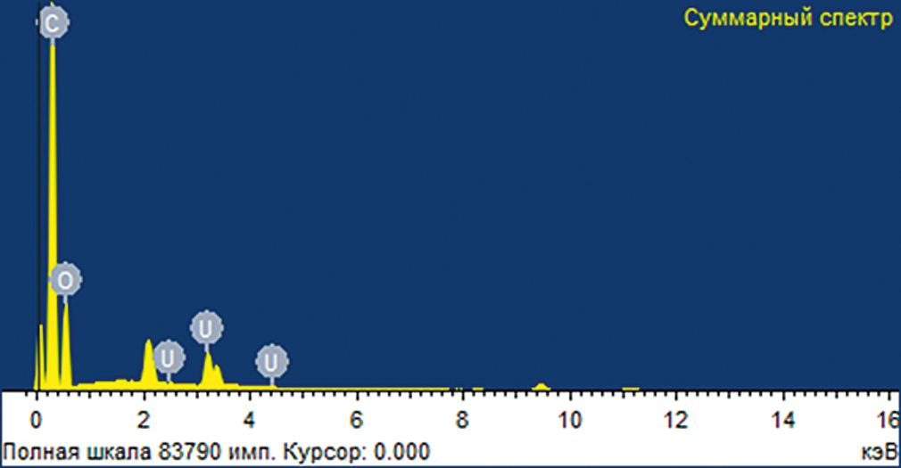 Сорбционные свойства сорбента 1в подтверждены также результатами ЭДС (рис. 11) и сканирующей электронной микроскопии (рис. 12). Так, в спектре и изображениях рис. 12 четко выявляются элементный состав полимера 1в, а также сорбированные уранил-ионы. Массовое содержание атома С в полимере 1в составляет ~62%, кислорода ~ 23%, а сорбированного в 1в урана в среднем ~ 9%. Полученные данные еще раз подтверждают осуществление процесса сорбции урана полимером 1в. Кроме того, показано равномерное распределение гранулы сорбента 1в после сорбции уранил-ионов, где явно видны сигналы урана (рис. 12г). На основании рентгено-флюоресцентной карты атома урана (Lα, 13.8 кэВ) сделан вывод о протекании процесса сорбции как на поверхности, так и в объеме (в гранулах) сорбента 1в, что объясняет сравнительно высокое количество атома урана в составе сорбента.