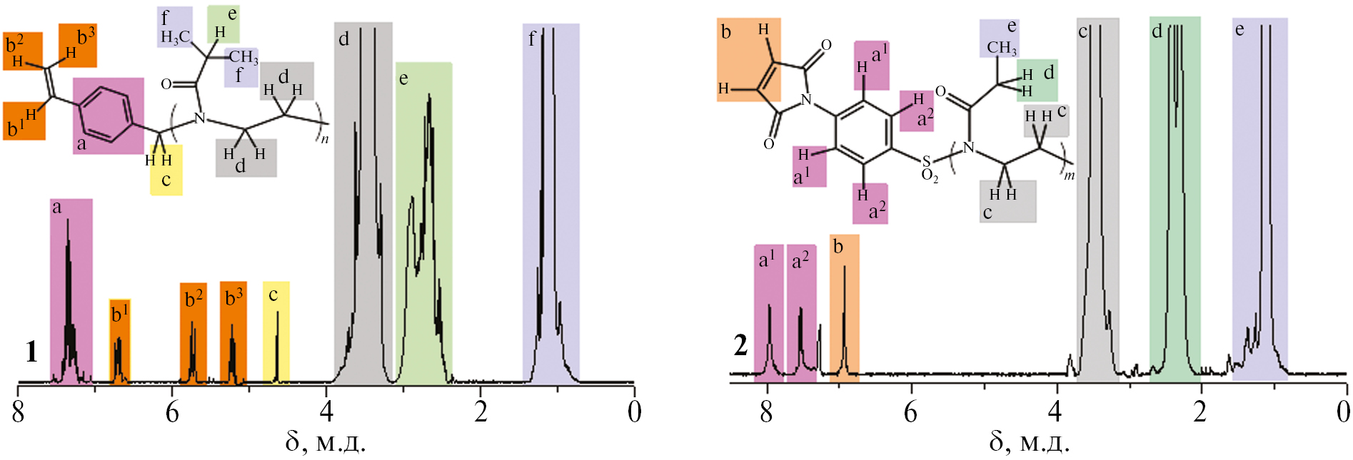 Рис. 1. Спектры ЯМР 1H макромономера поли-2-изопропил-2-оксазолина (1) и макромономера поли-2-этил-2-оксазолина (2). Цветные рисунки можно посмотреть в электронной версии