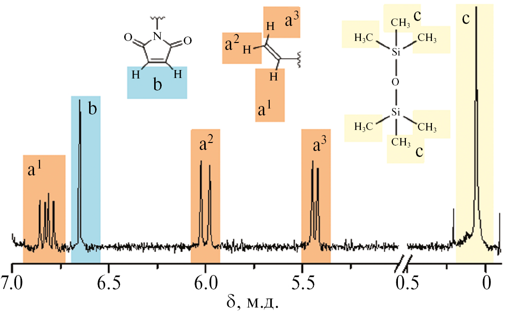 Состав сополимера анализировался методом спектроскопии ЯМР 1H. На рис. 2 представлен спектр ЯМР 1H исходной полимеризационной смеси макромономеров ММ-1 и ММ-2 в хлорбензоле с мономерным составом F1/F2 = 0.94. Отдельно стоящие сигналы малеимидных протонов CH (6.64 м.д. – сигнал “b”) и винильных протонов CH, CH2 (6.82 + 6.0 + 5.43 м.д. – сигналы “a1”, “a2”, “a3”) позволяют оценить степень конверсии соответствующих макромономеров и состав полученного сополимера. В качестве внутреннего стандарта для количественных измерений в реакционную смесь был добавлен гексаметилдисилоксан, который характеризуется интенсивным синглетным сигналом протонов групп CH3 (0.06 м.д. – сигнал “c”).