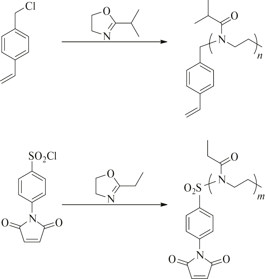 С целью получения альтернантных полимерных щеток с чередованием боковых цепей гидрофильного поли-2-этил-2-оксазолина и гидрофобного поли-изопропил-2-оксазолина были синтезированы макромономеры с винилбензильной и N-(4-сульфонилфенил)малеимидной концевыми группами: