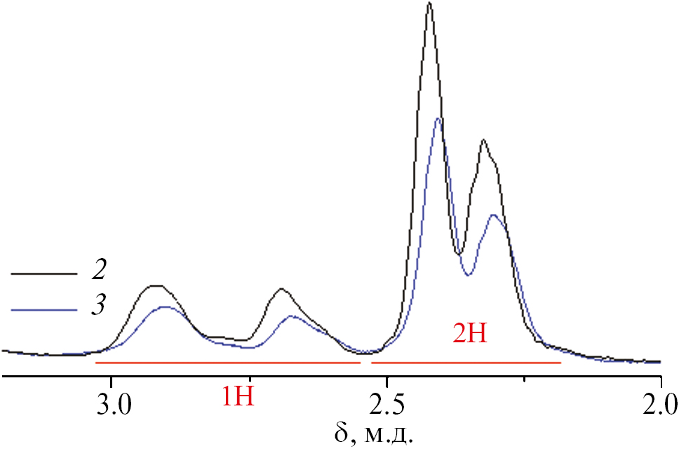 Рис. 5. Фрагмент спектров ЯМР 1H образцов 2 и 3, полученных в водных растворах