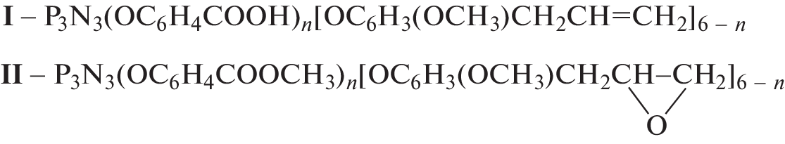 Carboxyl-containing aryloxycyclotriphosphazene (I) has been used for curing the ED-20 epoxy resin or a phosphazene-containing epoxy oligomer. In the case of ED-20, curing occurs in the range of 125‒220°C and is accompanied by an exothermic effect that increases from 26 to 50 J/g with an increase in the amount of aryloxycyclotriphosphazene (I) from 25 to 50%. The curing of the phosphazene-containing epoxy oligomer occurs in the temperature range of 140–240°C and is accompanied by an endothermic effect (−ΔH = 6.5–6.8 J/g). Cured compositions based on ED-20 + I are self-extinguishing (flammability class V‑1 according to UL-94), and phosphazene-containing epoxy oligomer + I compositions are noncombustible (class V-0 according to UL-94) regardless of the ratio of the initial components.