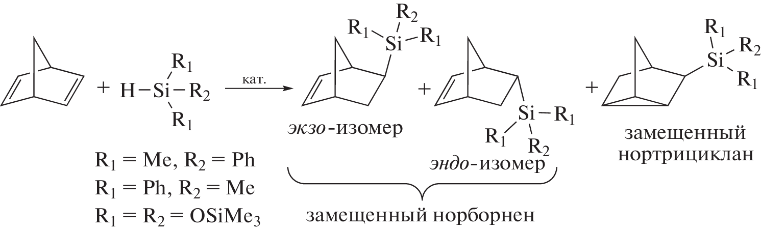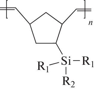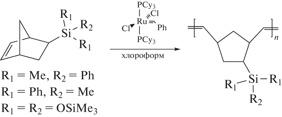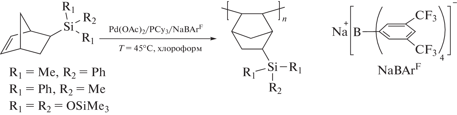 Three monosilicon-substituted norbornene monomers with phenyl and siloxane groups at the silicon atom are synthesized by the one-step hydrosilylation of 2,5-norbornadiene. The proposed method allows the synthesis of monomers with a higher content of polymerization-reactive exo-isomer in products compared with similar adducts formed by the Diels‒Аlder reaction. The synthesized monomers show high reactivity in both metathesis polymerization and addition polymerization more sensitive to the substituent volume. Using these monomers two series of high molecular weight silicon-substituted polynorbornenes are prepared which are found to be glassy and thermally stable polymers.