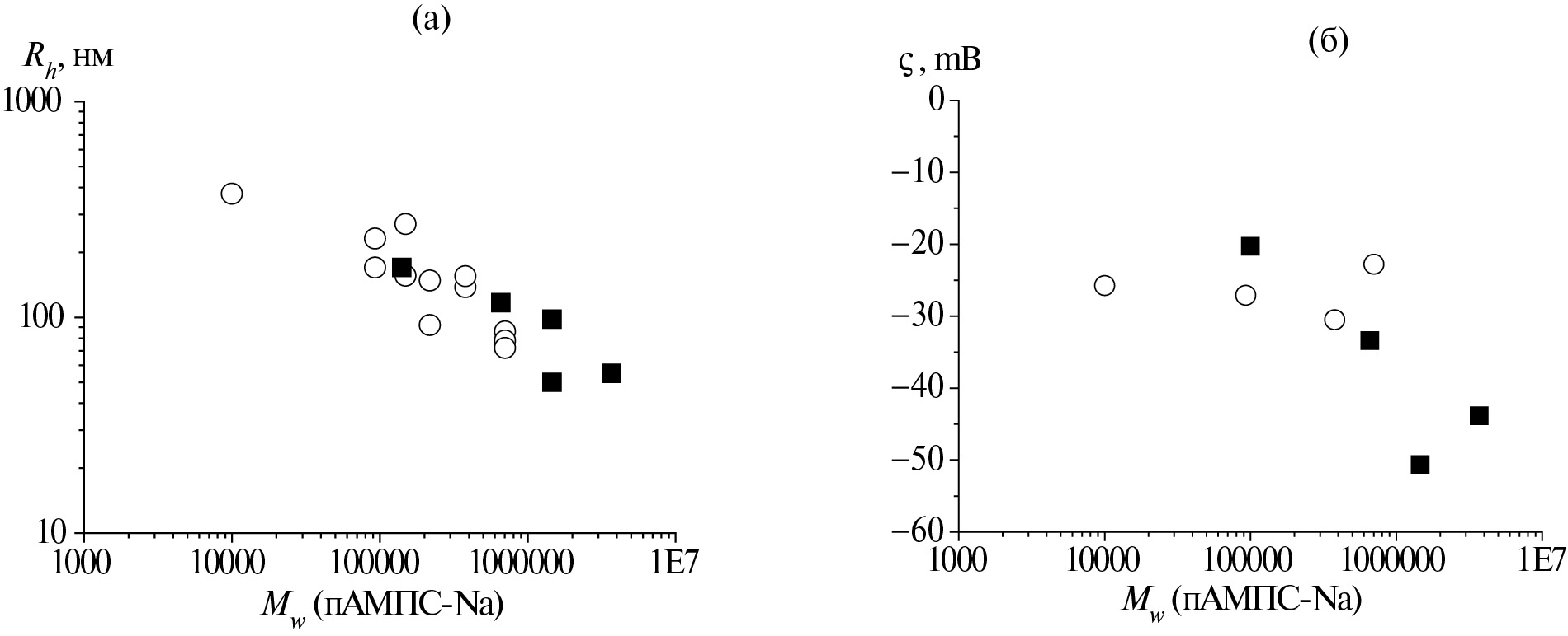 Рис. 3. Зависимости гидродинамического радиуса Rh ассоциатов частиц ИПЭК (а) и ζ-потенциала дисперсии (б) от молекулярной массы исходного полиэлектролита Mw (pAMPS-Na). Частицы ИПЭК получены полимеризацией молекул AUTA+: 1 – фракции pAMPS-Na (Ð < 1.4), 2 – дисперсные образцы pAMPS-Na (Ð > 2.5). Каждая точка на графике – отдельный синтез.