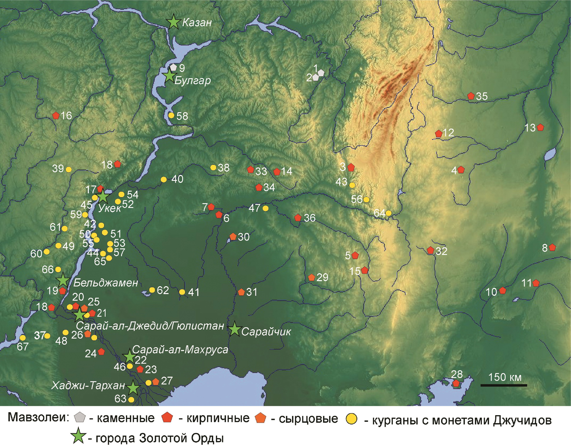 1 – Тура-хана; 2 – Хусейн-бека; 3 – Бэндэбике; 4 – Кесене («Башня Тамерлана»); 5 – Жангыз-Агаш; 6 – Малый Уральский; 7 – Большой Уральский; 8 – Кара-Яр; 9 – мавзолеи г. Булгара; 10 – Домолакер; 11 – у Метеостанции; 12 – на р.Увельке; 13 – Атчергат; 14 – Тептяри; 15 – Жаман-Каргала; 16 – Мохши; 17 – Укек; 18 – Мечетное; 19 – Водянское; 20 – Бахтияровский; 21 – Царевский; 22 – Селитренное; 23 – Комсомольское; 24 – 301-й км; 25 – Солодовка; 26 – Кривая Лука; 27 – Маячный Бугор; 28 – Кердери; 29 – Саралжин; 30 – Лебедевка VIII; 31 – Караул-Тобе; 32 – Абат-Байтак; 33 – у свх. Свердлова; 34 – Мустаевский; 35 – Троицкий; 36 – Изобильненский; 37 – Абганеровский; 38 – Августовка; 39 – Марьевка; 40 – Давдовка III; 41 – Марьевка; 42 – Ровное; 43 – Андреевское; 44 – Бережновка; 45 – Саратов; 46 – Лапас; 47 – Жарсуат; 48 – Купцын-Толга; 49 – Даниловка; 50 – Зауморье; 51 – Кеппенталь; 52 – Суслы; 53 – Харьковка; 54 – Боаро; 55 – Белокаменка; 56 – Тлявгуловский; 57 – Блюменфельд; 58 – Свх. Луначарского; 59 – Мордова; 60 – Сенной; 61 – Новая Меловатка; 62 – Жангала; 63 – Лапас; 64 – Новоорский; 65 – Новая Молчановка; 66 – Шляховский; 67 – Нагавский