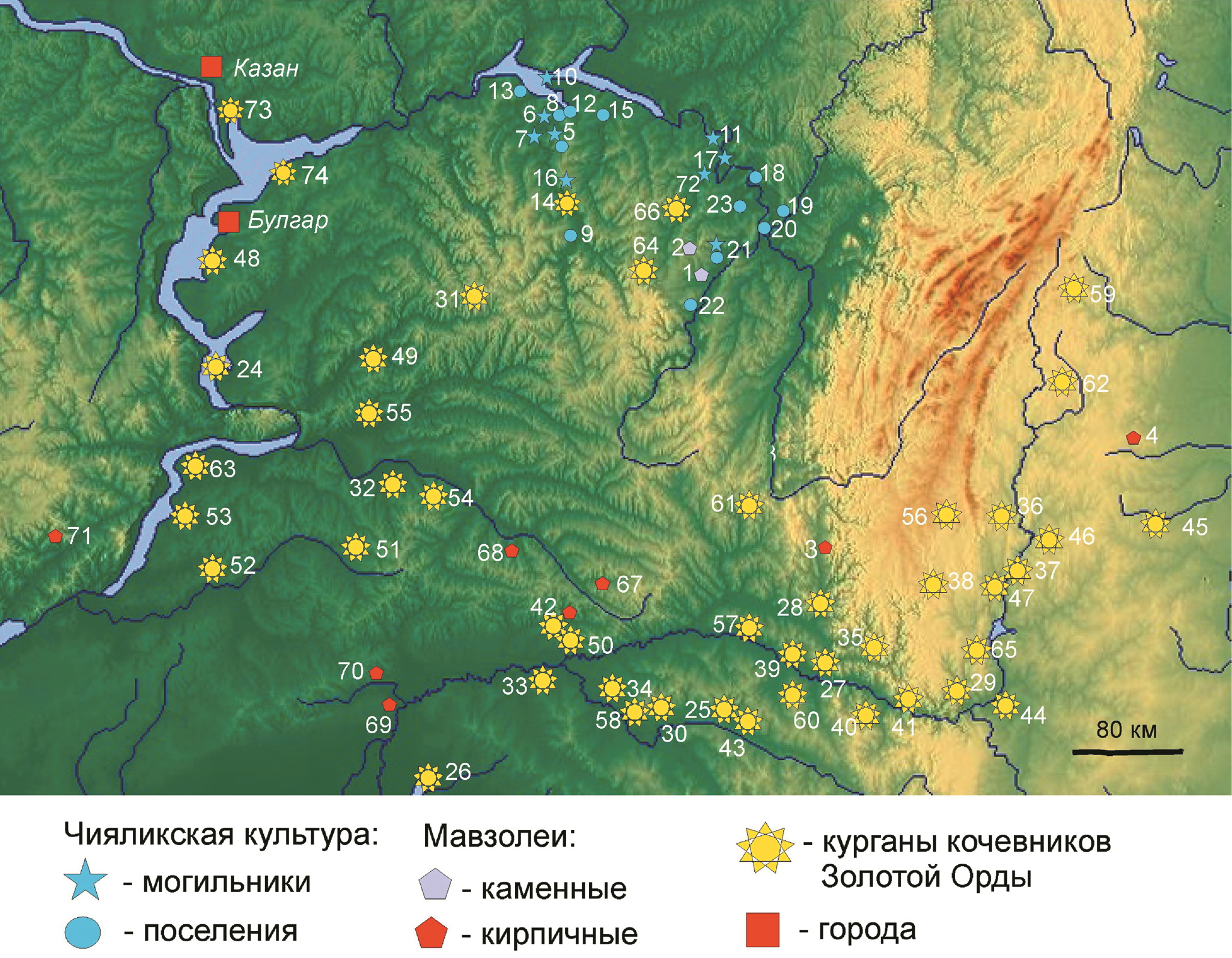 1 – Husein-bek; 2 – Tura-khan; 3 – Ufa II; 4 – Ufimskoye (Chortovo); 5 – Kara-Abyz; 6 – Gornovskoye I; 7 – Yabalaklinskoye; 8 – Podymalovskoye; 9 – Biktimirovskiy; 10 – Kazaklarovskiy; 11 – Mellyatamakskoye; 12 – Bayryaki-Tamak; 13 – Nagaybakskiy; 14 – Chiyalikskiy; 15 – Taktalachukskiy; 16 – Azmetyevskiy; 17 – Igimskoye; 18 – Derbeshkinskiy; 19 – Usayevskoye; 20 – Bikbulovskoye; 21 – Syntyshtamakskiy; 22 – Udryakbash; 23 – mausoleums of Bulgar; 24 – Taganayevskiy; 25 – Sauzovskiy; 26 – Kushulevskiy; 27 – Balymerskiy; 28 – Svkh. Lunacharskogo; 29 – Bolshoy Shikhan; 30 – Aleksandrovskiy; 31 – Pokrovka; 32 – Rozhdestvenskiy IV; 33 – Akkulayevskoye; 34 – Alekseyevskoye; 35 – Urmanayevskoye; 36 – Nizhnekhozyatovskoye