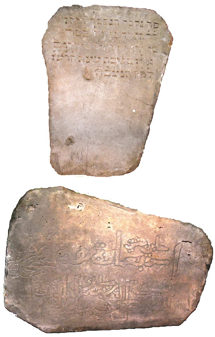 Fig. 1, 2. Gravestone with an inscription in Arabic and Hebrew (Stary Krym, 1892). Marble, stone carving, incised relief (“Central Museum of Taurida”, KP-15558, A-20750)
