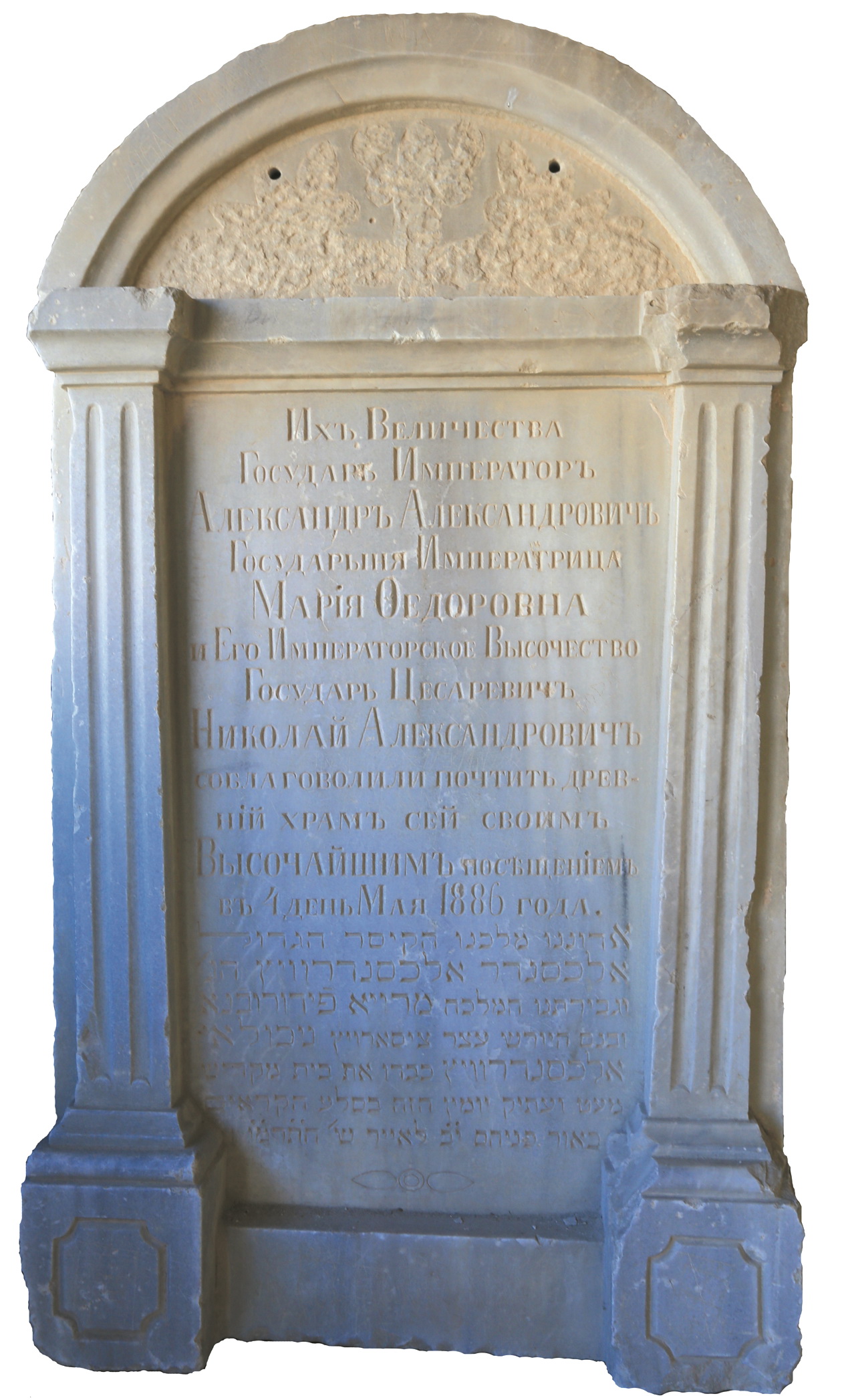 Fig. 5. Bilingual inscription (in Russian and Hebrew) at the entrance to the Cathedral Kenasa of Chufut-Kale, dedicated to the visit of Alexander III in 1886