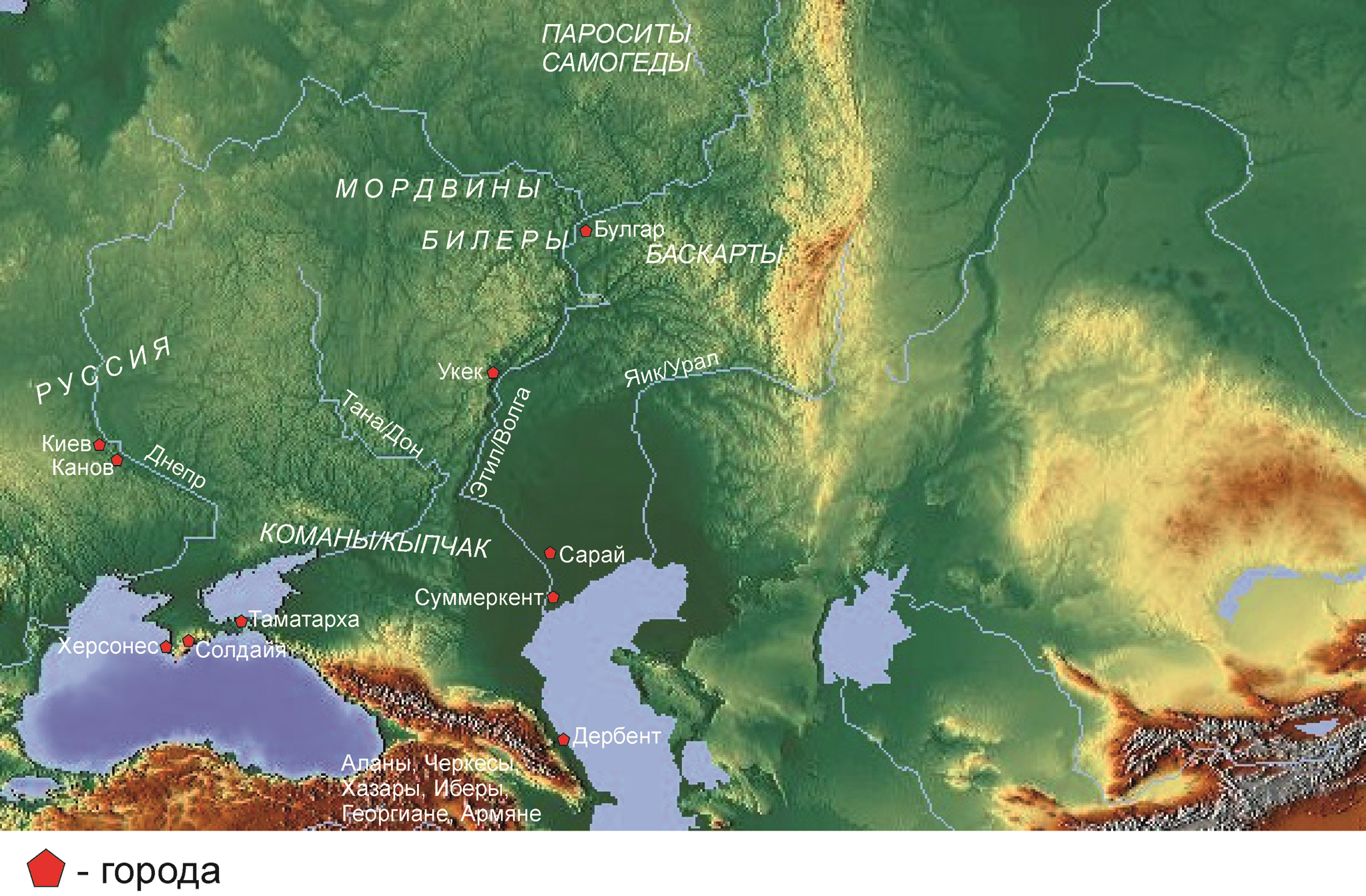 Итак, читатели XIII столетия14, знакомясь с содержанием перечисленных выше нарративов, видели перед собой страну, сплошь покрытую степями, по которым бродят кочевники «с их шатрами и стадами овец», и по которым протекают четыре больших реки, берущие свое начало где-то на севере – Днепр, Тана/Дон, Этиль/Волга и Яик. В этой стране есть четыре города – Булгар, Сарай, Укек и Суммеркент – с севера с ней соседствуют народы, уже покоренные «татарами» и платящие им дань мехами, а с юга – народы, которых ещё предстоит покорить (рис. 1).