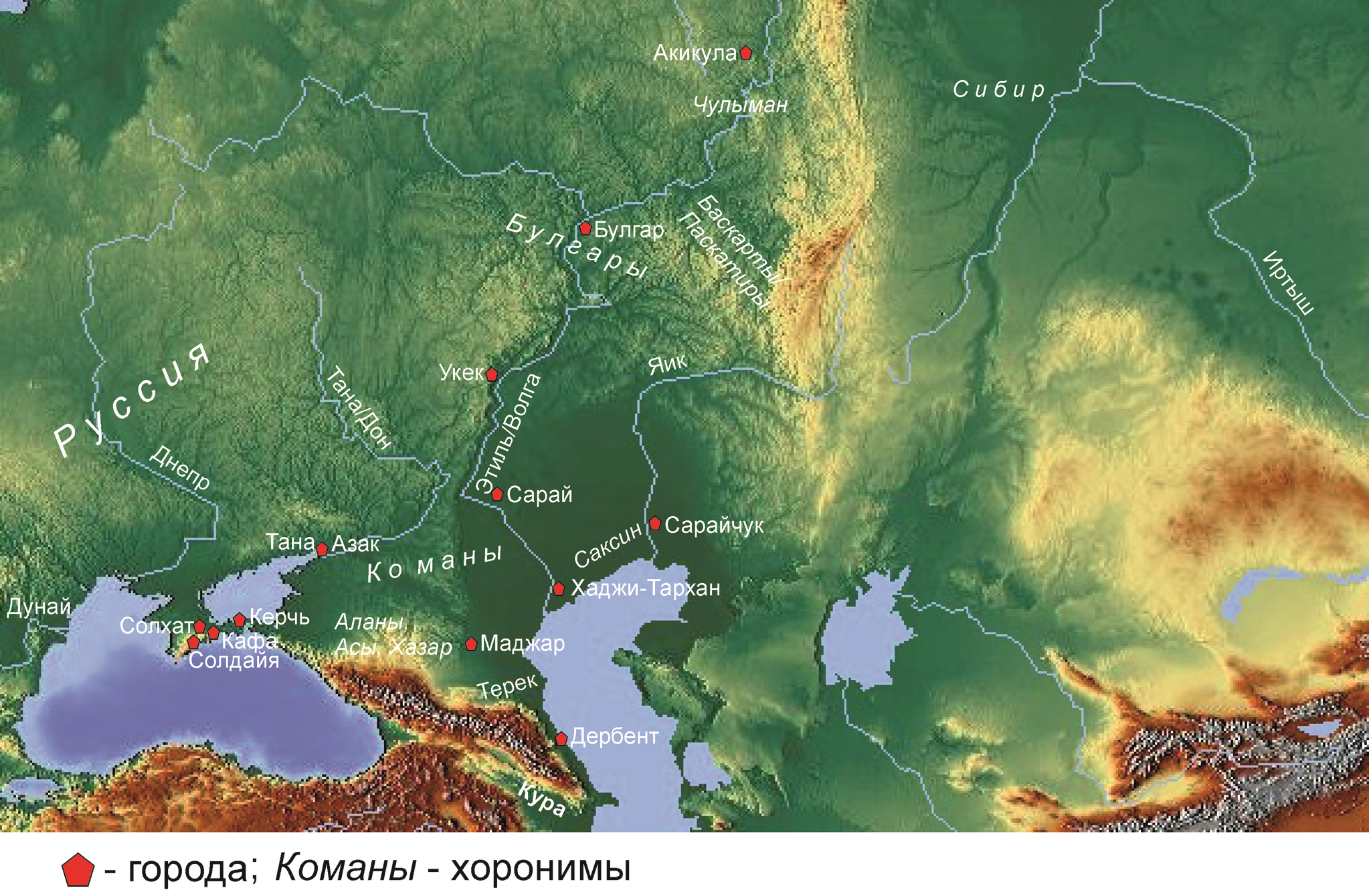 Итак, если составить виртуальный атлас Золотой Орды по сведениям нарративистов XIV в., то перед его читателем предстанет степная, населенная кочевниками кипчаками страна, по которой текут несколько больших рек и есть несколько городов (рис. 2).