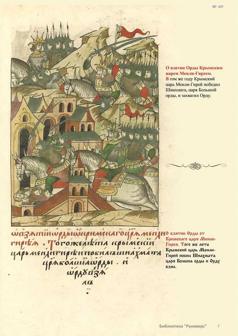 Fig. 1. Miniature “On the capture of the Horde by the Crimean Tsar Mengli Giray”. Illustrated Chronicle Collection [Litsevoy letopisny svod] of the 16th century. Russian Chronicle History. Book 18. 1503–1527. URL: https://runivers.ru/lib/book19785/594287/
