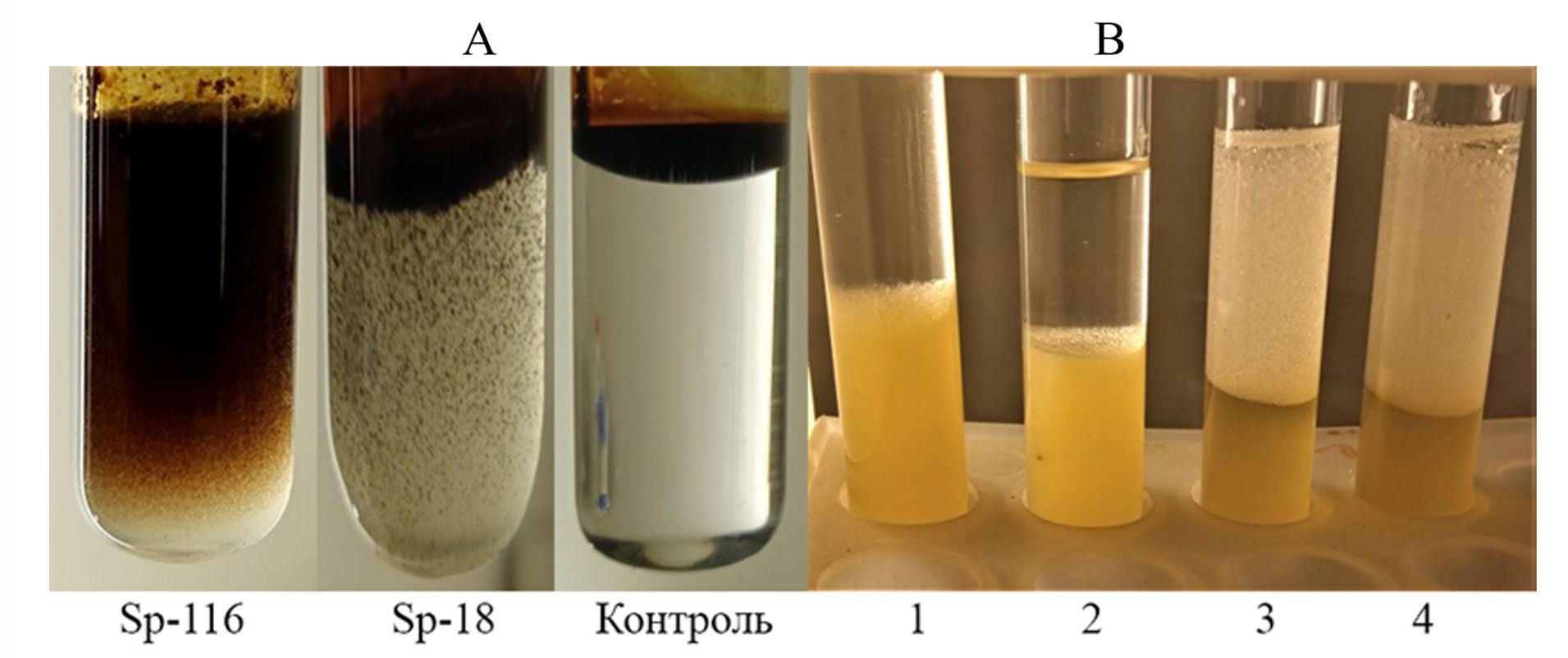 Биоэмульгирующая активность в эксперименте с бензином и керосином по методу Купера для штаммов-деструкторов оценена в пределах от 59 до 69%. Полученная эмульсия стабильно сохранялась на протяжение всего срока наблюдения в течение 1 недели. Для высокоактивного штамма Rhodococcus sp. Sp-116, быстро разрушающего пленку нефти и преобразующую ее в микроэмульсию, вспененная часть располагалась нетипично в нижней части раствора в пробирке (рис. 1b), в отличие от всех остальных деструкторов, у которых эмульсия располагалась типично в верхней части раствора, что свидетельствует о разном характере физического воздействия на нефть, секреции различных по химическому составу метаболитов.