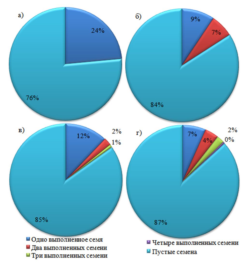 Рис. 4. Зависимость количества выполненных семян от их общего числа в шишкоягоде: (а) – шишкоягоды с одним семенем; б) – шишкоягоды с двумя семенами; в) – шишкоягоды с тремя семенами; г) – шишкоягоды с четырьмя семенами)