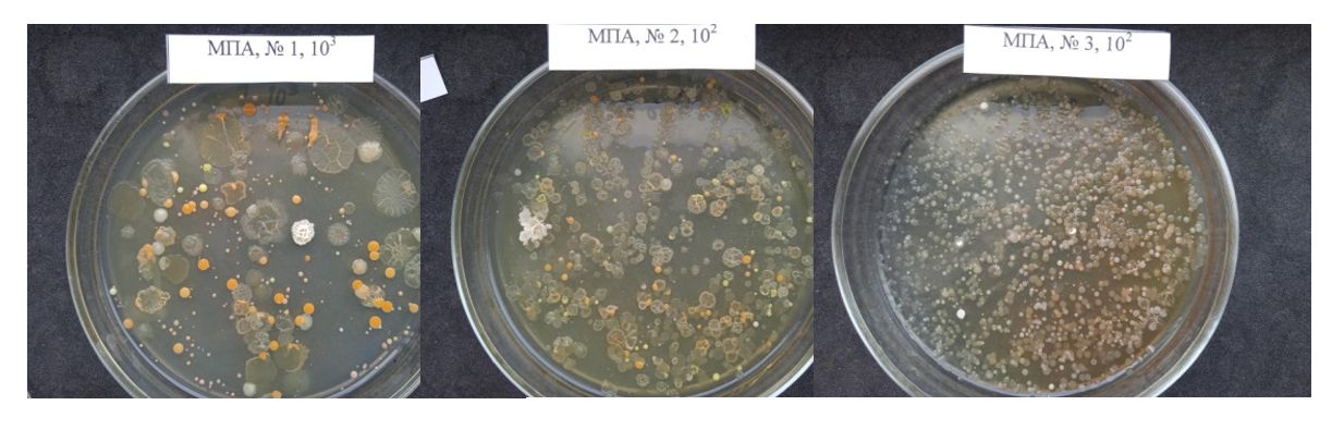 Численность сапрофитной микрофлоры (гнилостной, аммонифицирующей белки) определена посевом 0,1 мл разведений взвеси на поверхность МПА (рис. 1). Посевы были подсчитаны через 3-5 суток термостатирования при 30 °C.