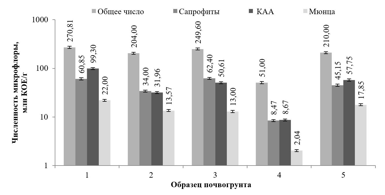 Количество микроорганизмов, растущих на среде с минеральным азотом, варьировалось от 31,9 до 99,3 млн КОЕ/г для образцов №№ 1, 2, 3, 5. В образце №4 их количество также было минимальным и составило 8,7 млн КОЕ/г. Так, количество микроорганизмов, растущих на КАА, варьируется в пределах от 15,6 до 36,6 % от общей численности. Количество сапрофитов и растущих на КАА сопоставимо во всех образцах.