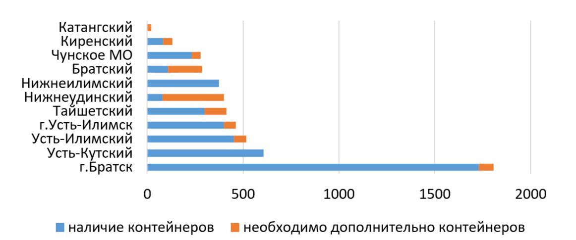 На рисунке 2 видно, что ситуация с контейнерами в Черемховском и Свирском муниципальных образованиях, а также Осинском, Баяндаевском, Заларинском, Балаганском районах стоит весьма остро. В Зиминском, Куйтунском, Аларском и Нукутском районах по данным Министерства природных ресурсов и экологии Иркутской области на 2020 год практически отсутствовали контейнеры, при том, что их необходимость назрела очень серьезно. В Иркутске при наличии 12275 контейнеров и 108 бункеров, все же не хватает еще 399 штук, и 376 необходимы для замены пришедших в негодность. В Ангарске практически решен вопрос с необходимым количеством контейнеров.