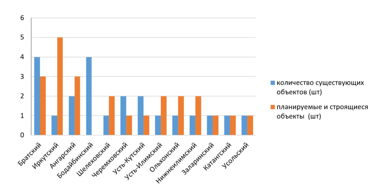 На этом рисунке отражены только те районы Иркутской области, где уже имеются полигоны для сбора и переработки отходов. Практически в каждом районе запланированы объекты для работы с отходами. Например, в Иркутском районе к 2027 году должно быть введено в строй два ресайклинг-центра, а также проведено расширение имеющегося полигона. В Бодайбинском районе на настоящий момент имеется четыре полигона, которые полностью выполняют свои функции и у каждого из полигонов имеется запас вместимости, особенно у полигона, созданного в 2015 году в 9 км от поселка Кропоткин. Те районы, которые не отражены на приведенном рисунке, на 2020 год не имели ни одного полигона, но большинство из них до 2026 года должны быть полностью обеспечены объектами утилизации.