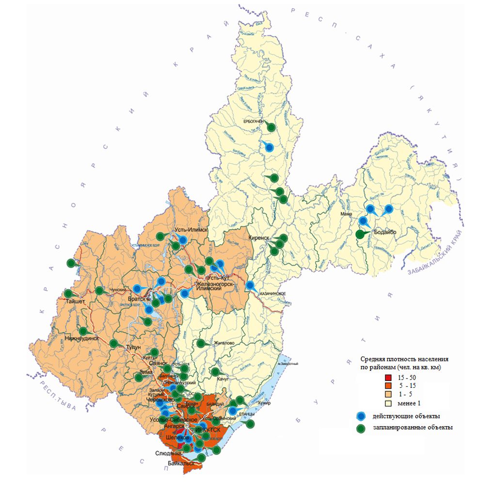 На данной картосхеме отчетливо выделяются южные районы с плотностью населения до 50 чел. на км2, которые подвергаются наибольшему воздействию. К ним относятся Иркутский, Усольский, Зиминский и часть районов Усть-Ордынского Бурятского округа. Крупные города области стоят особняком и нуждаются в пристальном внимании экологов из-за высокого показателя отходов, выбрасываемых в среднем на каждого жителя.