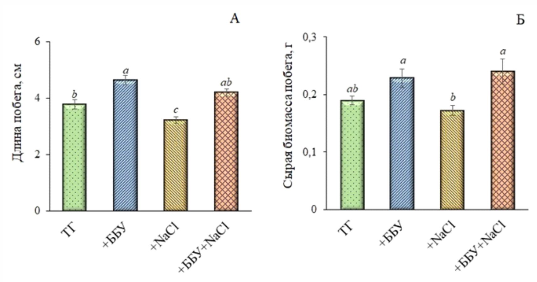Обработка солевым раствором ингибировала длину и биомассу побега в среднем на 15% от контроля (рис. 1). Совместное влияние ББУ и NaCl не было значимым (F = 0,75; p = 0,48), однако длина и биомасса побега увеличивались на 11 и 23%, соответственно, следовательно, внесение ББУ в некоторой степени нивелировало солевой стресс и способствовало росту горчицы.