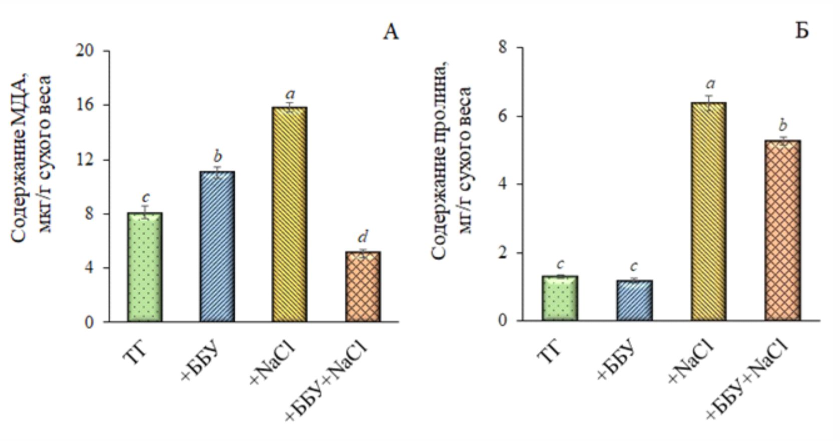 Рис. 3. Содержание малонового диальдегида, МДА (А) и свободного пролина (Б) в листьях трехнедельных сеянцев горчицы сарептской. ТГ – контрольный торфогрунт. ББУ – бактериальное биоудобрение. Представлены средние арифметические значения ± SE (n = 4). Разными латинскими буквами отмечены достоверные различия между вариантами при p < 0,05