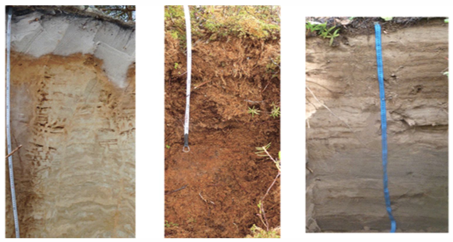 Рис. 2. Основные типы почв Сибирских увалов: а) подзол языковатый криометаморфический (точки 1-П, 44-Ф, 97-Ф); b) олиготрофная торфяная почва (точки 5-П, 57-Ф); с) аллювиальная дерновая почва (точки 3-П, 49-Ф)