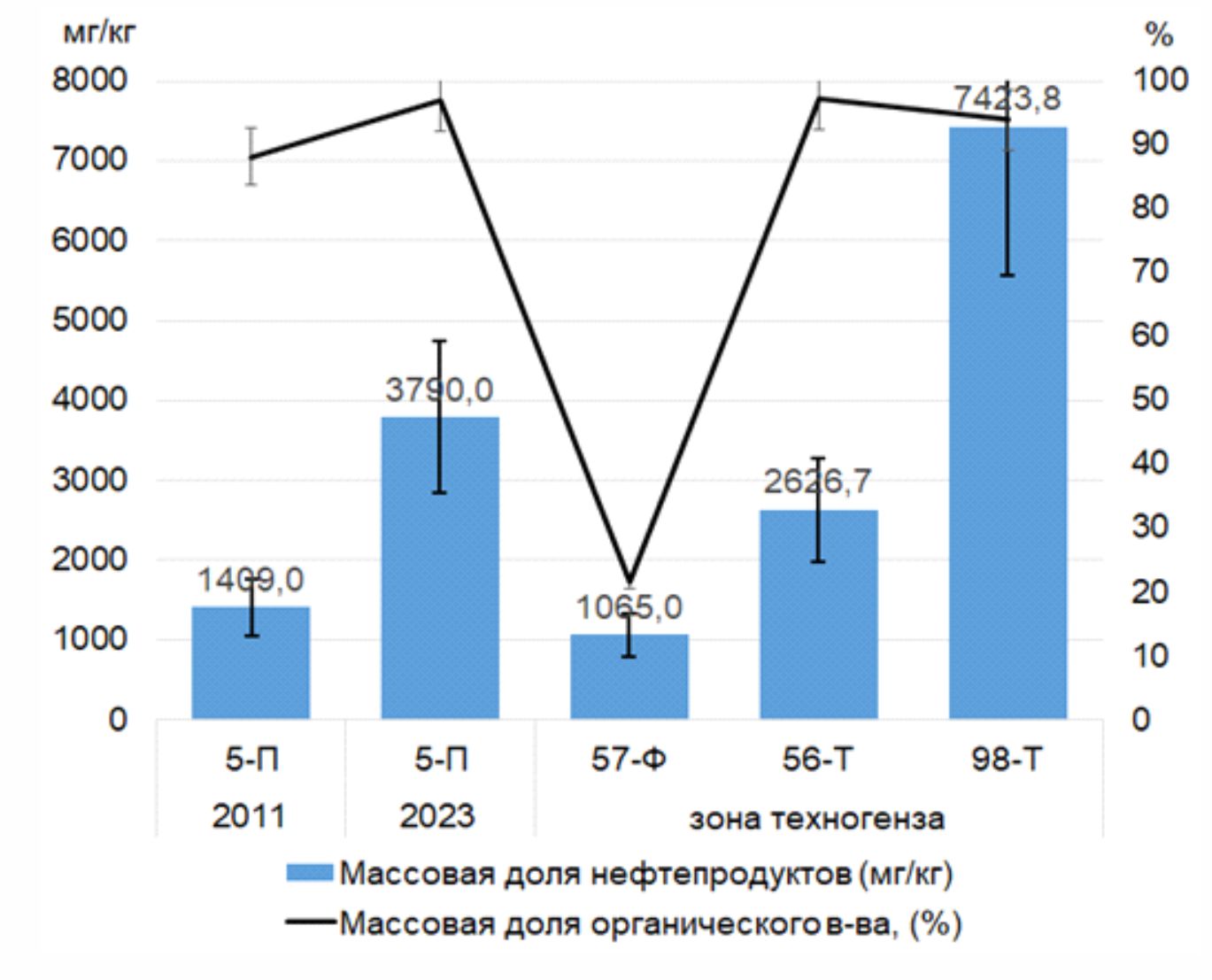 Рис. 3. Среднее содержание органического вещества и нефтепродуктов в пробах фоновых торфяных олиготрофных почв и торфяных нефтезагрязнённых в зоне техногенеза