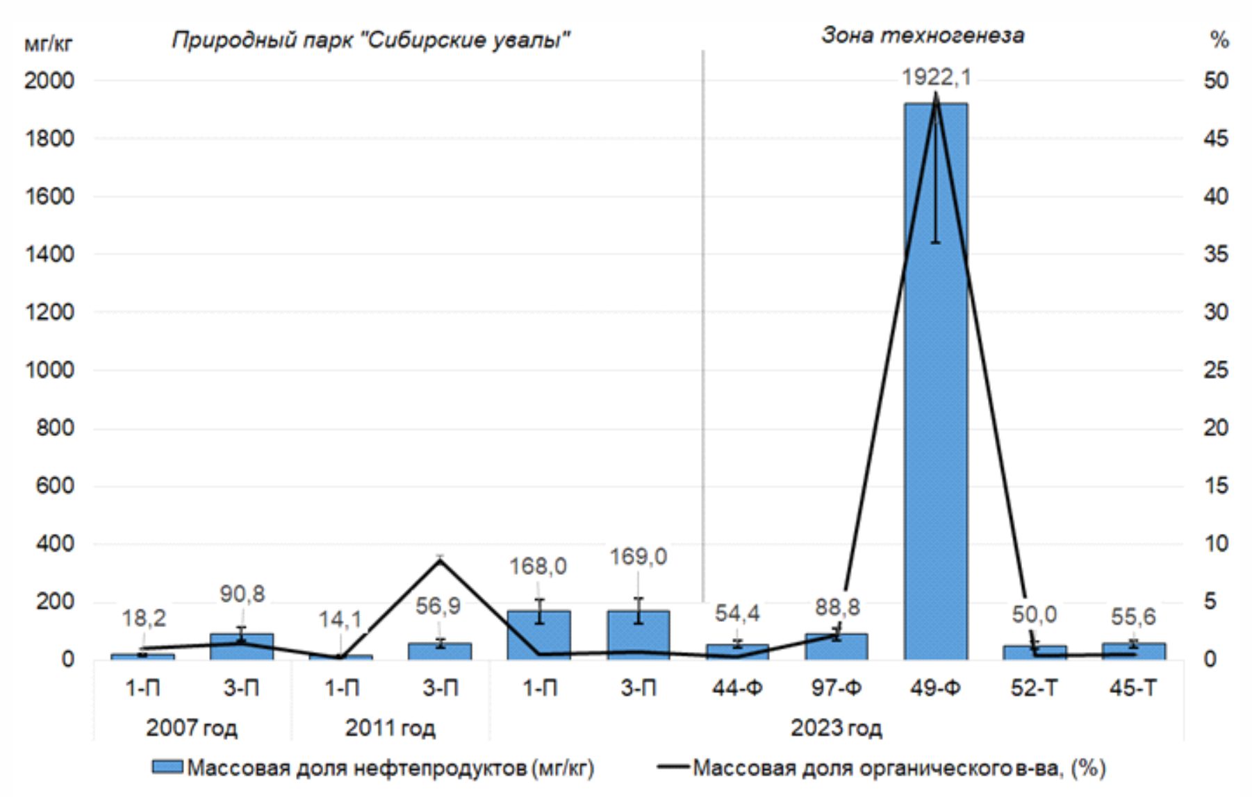 Присутствие нефтепродуктов в органогенных (преимущественно торфяных) горизонтах почв ПП Сибирские увалы, по-видимому, является региональной особенностью. Торфяные олиготрофные почвы в ХМАО – Югре являются самыми распространенными типами почв. Это основной тип почв на месторождениях, и он же наиболее часто подвергается рекультивации после техногенных воздействий.
